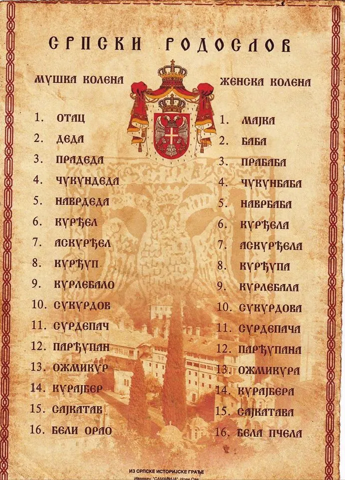 Naš jezik je toliko bogat da se mi ponekad iznenadimo kad čujemo neku reč i njeno značenje. Jedan od primera koji govori u prilog ovoj tvrdnji je i video i kome je detaljno opisano kako se nazivaju naši preci 16 kolena unazad. Mi koristimo samo nekoliko. Recimo znamo ko su naši preci do prababe i pradedee ili eventualno do čukundede ili čukunbabe.