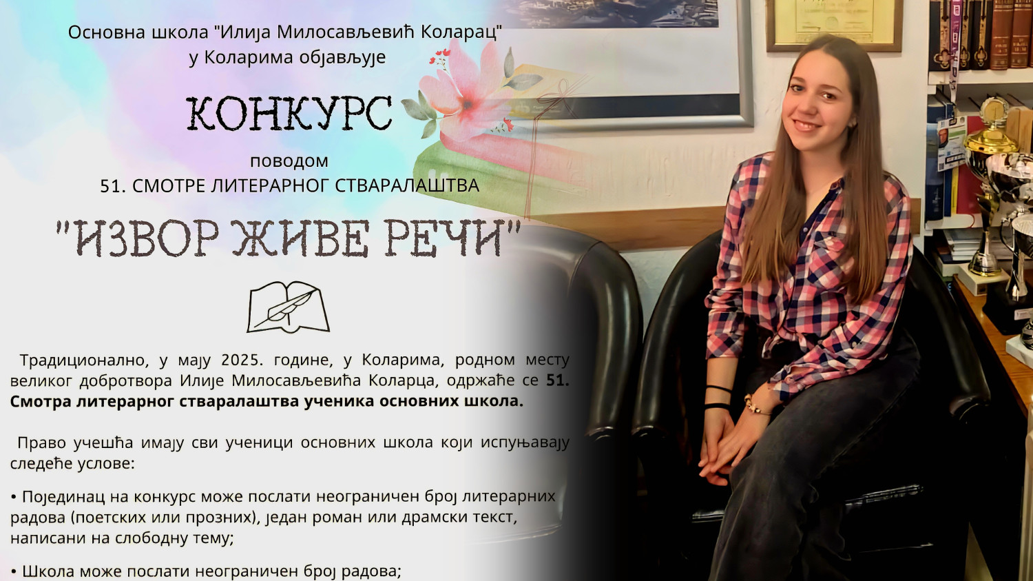 Učenica Una Rudolf 8/2 iz Osnovne škole „Vuk Karadžić“ u Vranju ostvarila je izvanredan uspeh na 51. Smotri literarnog stvaralaštva učenika osnovnih škola pod nazivom „Izvor žive reči“, održanoj u organizaciji Osnovne škole „Ilija Milosavljević Kolarac“ u Kolarima. Una je osvojila prvo mesto i proglašena je za SVEUKUPNOG proznog pobednika ove prestižne smotre!