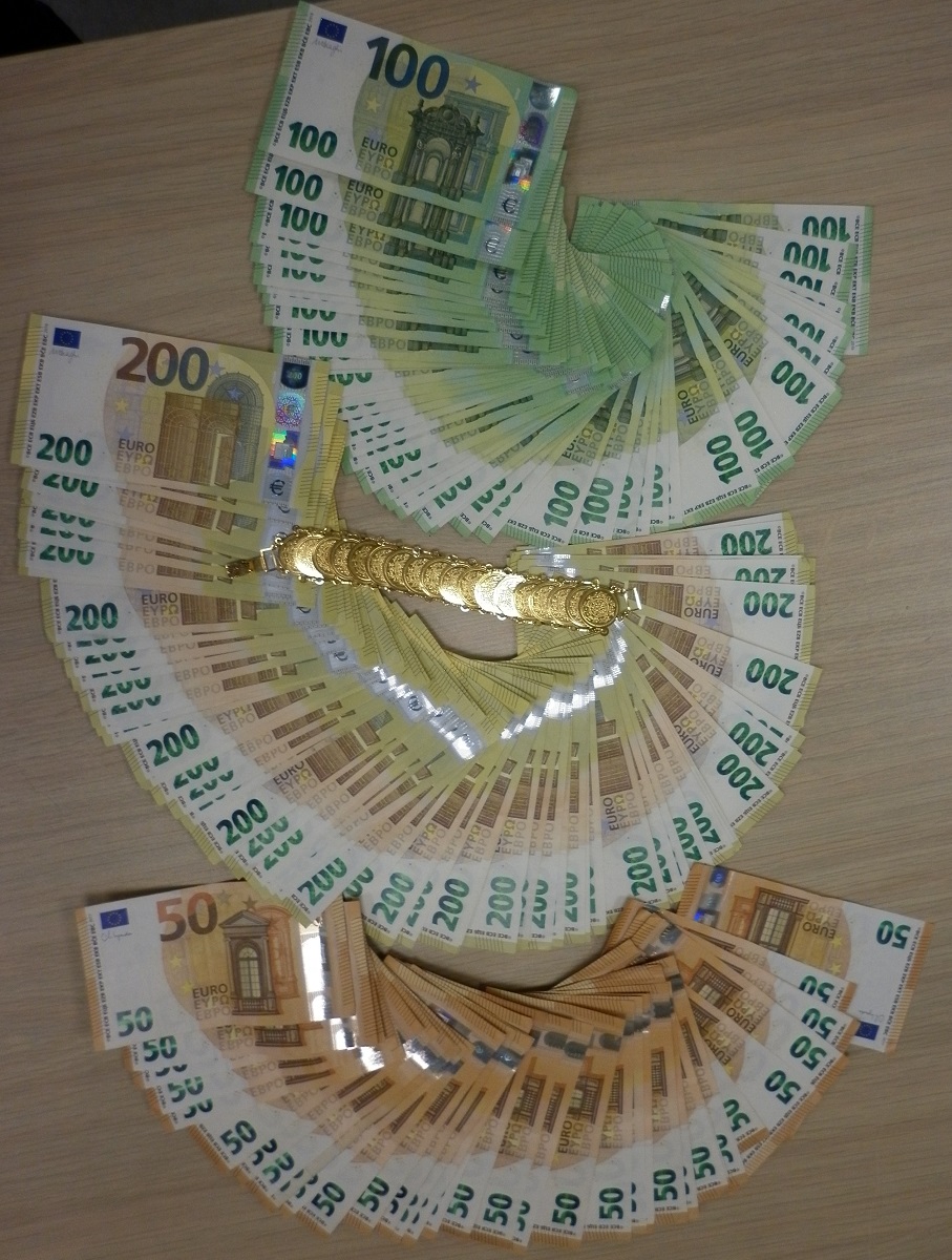 Najpre je kod vozača pronađeno skoro 27.000 evra, od kojih je veći deo bio sakriven u čarapi koju je putnik nosio na sebi. Pored neprijavljenog novca, otkriveno je i pet velikih zlatnih dukata “Elizabeta II” ukupne težine preko 155 grama. Kod drugog putnika je, osim prijavljenih 12.500 evra, pronađeno i 20.000 neprijavljenih evra u prsluku, kao i narukvica sastavljena od 18 manjih dukata. Gotovo 37.000 evra i neprijavljeno zlato zadržani su do okončanja postupka pred sudom.
