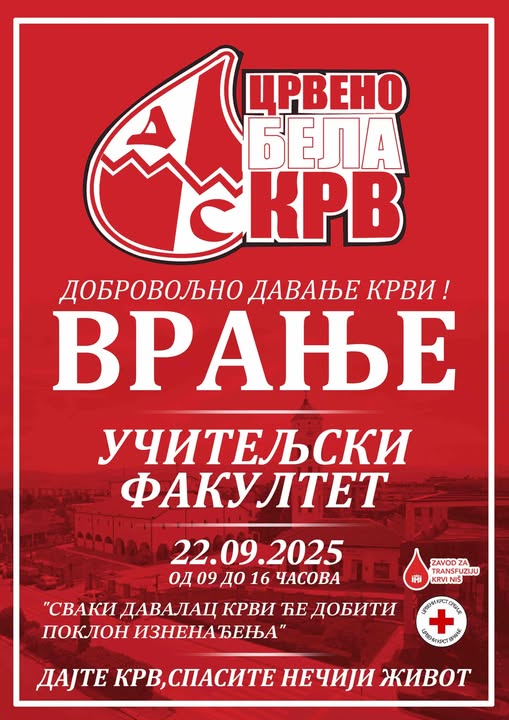 Na Pedagoškom fakultetu u Vranju će u ponedeljak, 22. septembra 2025. godine, biti organizovana akcija dobrovoljnog davanja krvi.