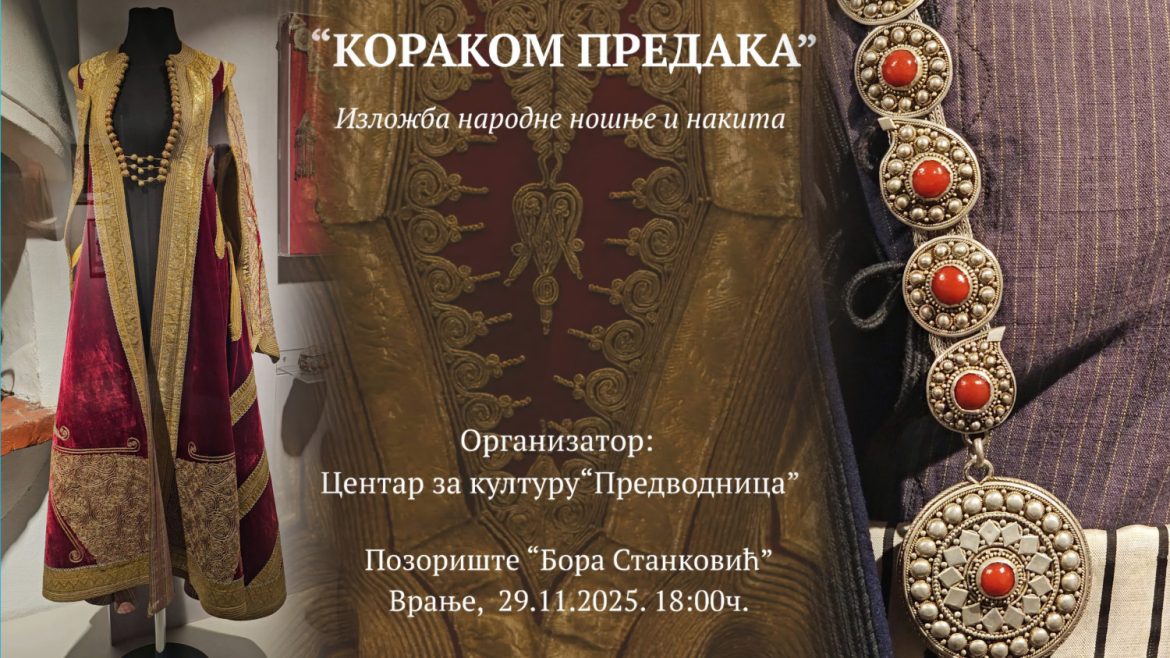 U Vranju će u organizaciji Centra za kulturu “Predvodnica” biti održan kulturni događaj pod nazivom “Korakom predaka”. Reč je o o izložbi narodne nošnje i nakita, a ovo veče će u Pozorištu “Bora Stanković” proteći u tradiciji, lepoti i eleganciji autentičnih narodnih nošnji i nakita iz različitih krajeva Srbije.
