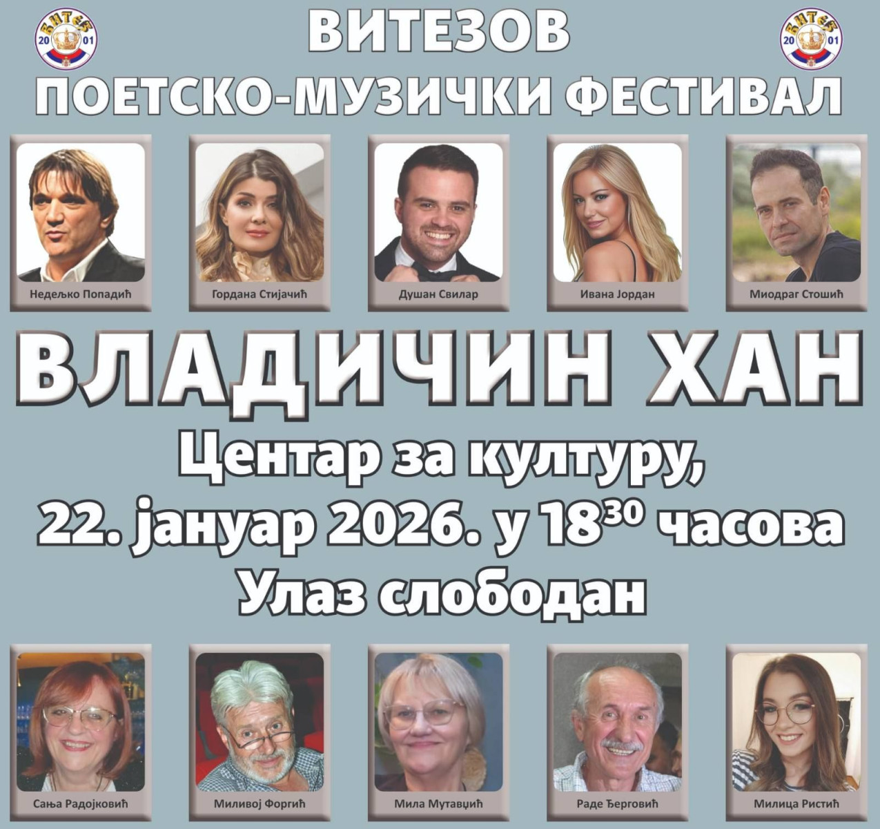 Pozivaju se svi ljubitelji lepe reči i kvalitetne muzike da svojim prisustvom uveličaju ovaj događaj i uživaju u nastupima umetnika koji u Vladičin Han donose duh tradicije i savremenog stvaralaštva.
