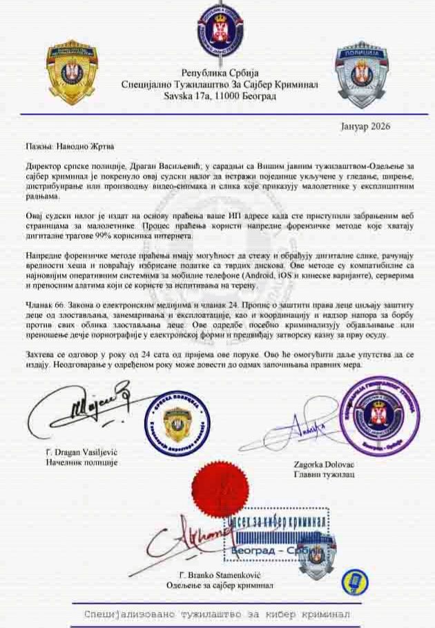 Služba za borbu protiv visokotehnološkog kriminala Uprave za tehniku Ministarstva unutrašnjih poslova Republike Srbije upozorava građane na učestalost internet prevara u kojima se lica putem elektronske pošte lažno predstavljaju kao sudovi, tužilaštva ili druge državne institucije. U okviru ovih prevara građanima se dostavljaju poruke uznemirujuće i preteće sadržine, u kojima se pominju navodne krivične prijave, IP adrese, hitni rokovi za postupanje (npr. 24 časa), kao i ozbiljne zakonske sankcije, sa ciljem da se primalac: navede da odgovori na poruku, dostavi lične ili druge osetljive podatke, klikne na maliciozne internet linkove, ili preuzme zlonamerne sadržaje.