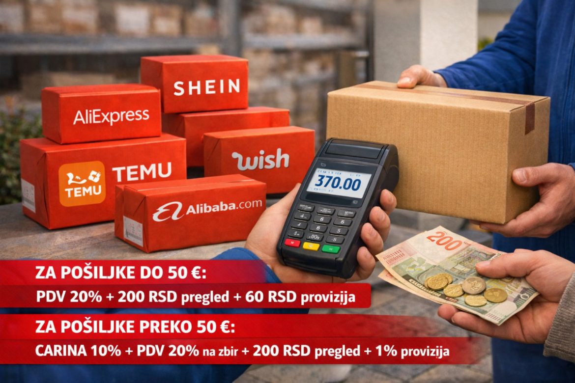 Pošiljke vrednosti do 50 evra: Iako su oslobođene carine, na njih se obračunava 20% PDV-a na vrednost robe. Uz to, kupac plaća fiksni trošak od 200 dinara za uslugu carinskog pregleda i 60 dinara provizije za prenos novca. Primer: Ako naručite sitnicu od 5 dolara (oko 550 dinara) uz besplatnu dostavu, dodatni troškovi će iznositi oko 370 dinara, što značajno menja finalnu cenu proizvoda.
