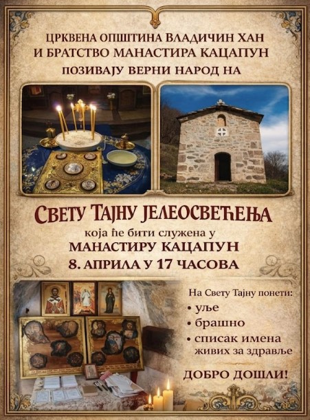Crkvena opština Vladičin Han i bratstvo manastira Kacapun upućuju poziv vernom narodu da uzme učešće u Svetoj tajni jeleosvećenja koja će biti služena u ovom manastiru. Ovaj svečani čin i zajednička molitva za zdravlje i isceljenje zakazani su za 8. april sa početkom u 17 časova.