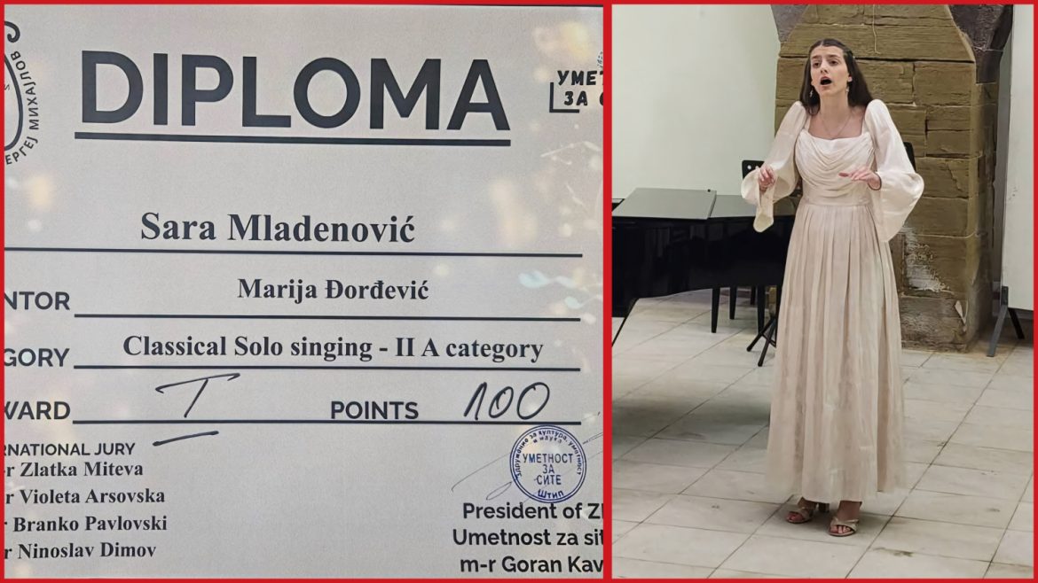 Sara Mladenović, mlada i talentovana umetnica iz Vladičinog Hana, ostvarila je podvig za pamćenje na prestižnom međunarodnom takmičenju mladih muzičara „Sergej Mihajlov“, održanom u Štipu. U izuzetno oštroj međunarodnoj konkurenciji, naša sugrađanka je svojim nastupom ostavila stručni žiri bez daha, osvojivši maksimalnih 100 od mogućih 100 poena.